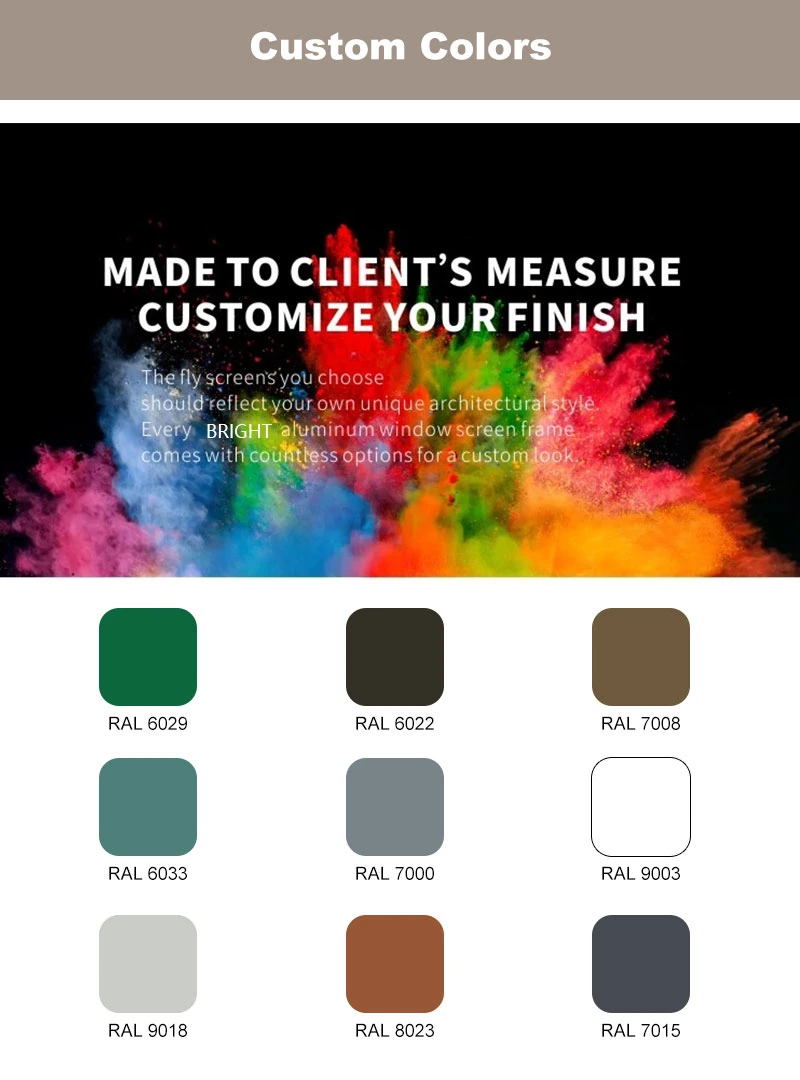 The material of main frame is aluminum alloy and the net is fiberglass mesh with plastic accessories. Our products are suitable for the window frame or door frame of various materials.